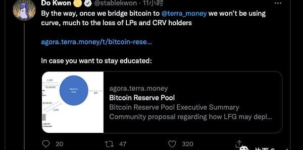 此外,DoKwon在本文撰写时的约10个小时前在推特上表示,一旦Terra自己的Bridge做好,未来可能就不会再使用Curve,届时可能会对Curve以及Convex是较大利空。