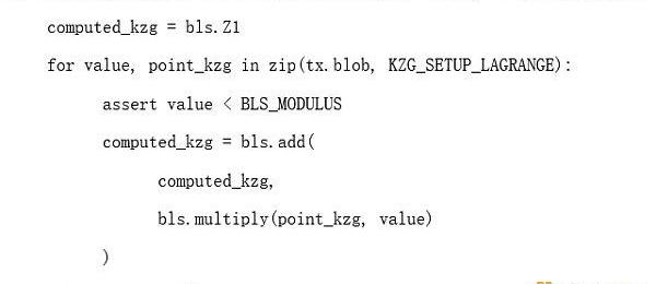 对blob的承诺是KZG承诺对该多项式的一个哈希。然而,从实现的角度来看,关注多项式的数学细节并不重要。相反,只会有一个椭圆曲线点的向量,而KZG对blob的承诺将只是一个线性组合。引用EIP-4844的代码: