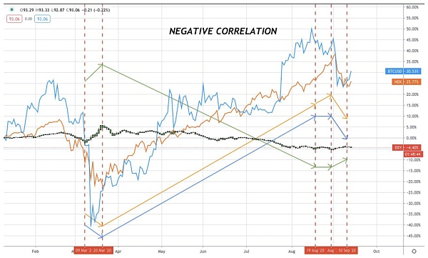 需要指出的是,自今年年初以来,短期内一直存在负相关关系。那么这就提出了一个问题:DXY短期看涨的形态会不会导致BTC和纳斯达克100的价值下降?