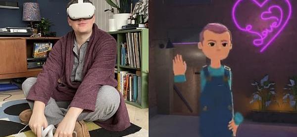 作者戴着META头盔,和他在VRCHAT中的ALTSPACEVR化身的合成图像。