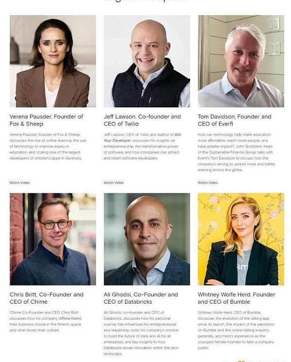 在数字颠覆者主题中,高盛则重点介绍一些数字公司领导人,包括Fox&Sheep创办人VerenaPausder、Twilio共同创办人兼执行长JeffLawson、Everfi创办人兼执行长TomDavidson、Chime共同创办人兼执行长ChrisBritt、Databricks共同创办人兼执行长AliGhodsi、Bumble创办人兼执行长WhitneyWolfeHerd等。