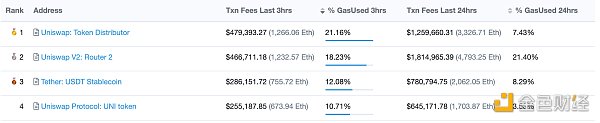 根据Etherscan的数据,在过去三小时内,UNI代币的智能合约地址目前在总交易费用方面排名第四,截至发稿时,总共673.94枚ETH,约合253,765美元。