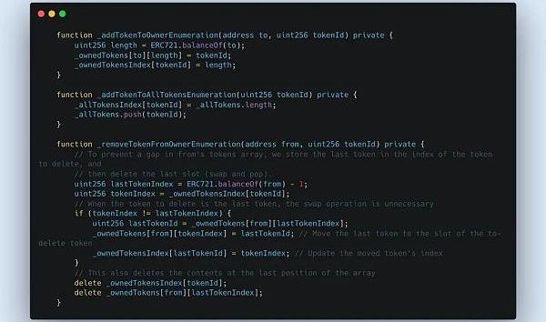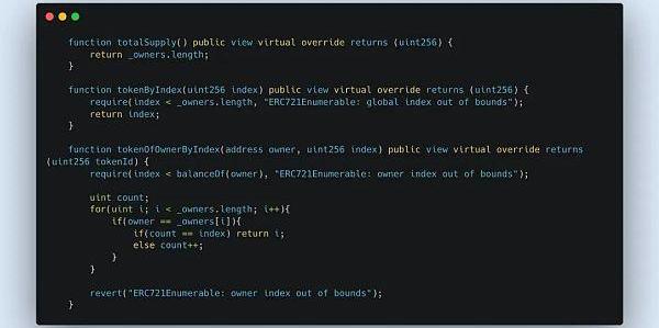 建议大家阅读整篇文章,熟悉解决方案,这个合约的基本前提是,它把优化的重心翻转过来,把写入函数的成本优化为读取函数的成本。这很好,因为如果读取函数在链下被调用,那么它们不会花费我们的钱。背后的基本原理ERC721Enumerable可以访问以下三个函数:totalSupply、tokenByIndex和tokenofOwnerByIndex。