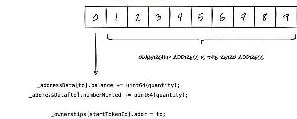 ERC721A所采用的方法乍一看似乎是反直觉的,所以让我们来看看在不同操作期间如何写入和读取存储以达到合约的正确状态。