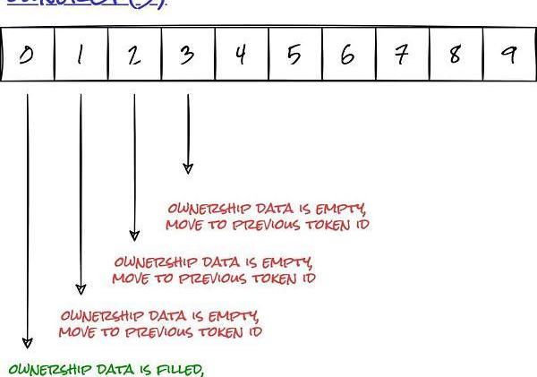 让我们假设这个操作遵循上一个铸造10个代币的操作。我们感兴趣的是代币ID为3的所有者,因此我们调用ownerOf(3)。ownerOf(3)]处的槽是空的,所以函数移动到前面的ID。直到找到一个具有所有权地址的代币为止。