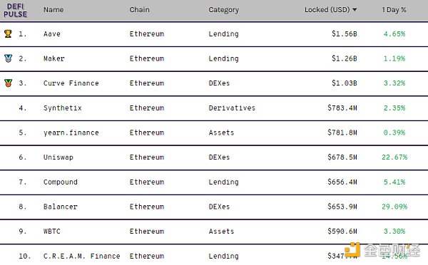 DeFi排名前十锁仓量 数据来源:DeFi Pluse