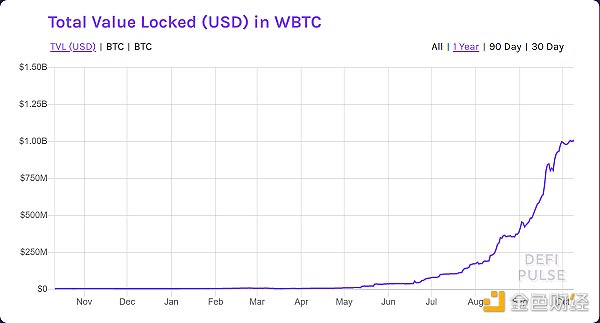 金色财经 区块链10月8日讯 随着去中心化金融行业热潮不断升温,在过去的两个月时间里,DeFi用户已经利用Wrapped Bitcoin(wBTC)将价值9亿美元的比特币代币化,而wBTC锁仓总价值也超过了10亿美元。