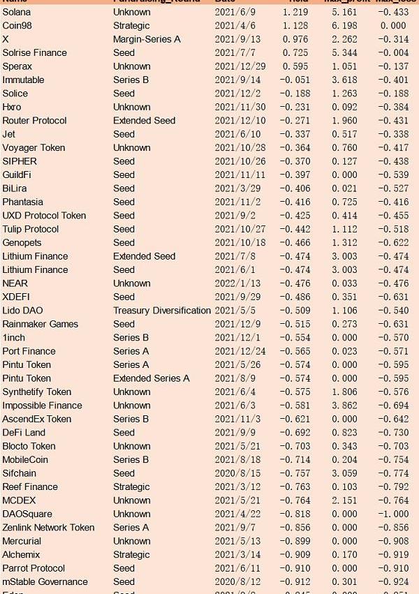 非常重要的一点是,项目token的损益不是从发行日开始算起,而是从融资信息公布日开始算。以AxieInfinity为例,该项目发行至今上涨了超过300倍,a16z与Paradigm等一众知名VC都参与了其B轮融资,但如果按发行以来的收益率计算就会高估他们的实际收益率。事实上,B轮融资是去年10月公布的,而Axie的暴涨发生在去年夏天,如果只计算10月以来收益率,那么真实数字为-50%。