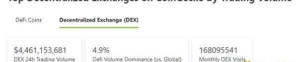 2.过去24小时去中心化交易所的交易量:44.61亿美元