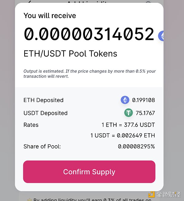 9.等待交易确认后,我们点击到ETH-USDT流动性供应页面,将代币存入流动性池。因为价格随时变化,而usdt和eth的价值要相同,所以可以点击usdt的MAX按钮,这样可以明确将多少个ETH存入。点击Approve后,继而点击钱包弹出的页面确认。