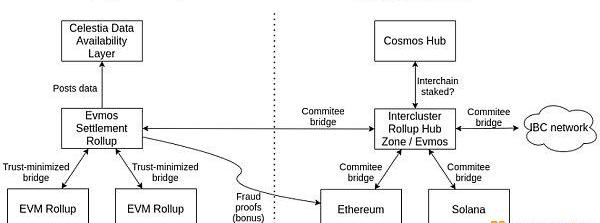 到这里,模块化的必然性就已经出现了,现在我们甚至不必再讨论扩容的方法将会有哪些,Layer2已经从一种可能性坍缩成了现实,将公链解耦的模块化就是答案。我们可以把上述三项功能中,其中至少一项单独外包出去的公链称为模块化公链,比如以太坊,它把执行层外包给了Layer2。也比如Polkadot和Near,它们有分片验证的外包设计。而Avalanche则像一个伪模块化公链,它看到了模块化的好处,于是做了一个单片链的组合,也让公链的基本功能在自家门内做了解耦,缺憾是目前还没有做好共享安全性。Cardano则处在一个临时状态,尽管没把已经解耦的功能外包出来,但从路径图上看也只是时间问题了。这些都是公链在模块化上所做的尝试,而模块化的最终愿景可能是Celestia与Evmos合作的那样——一个Rollup套娃,具体在开头所提文章中有展开阐述。所以,长远来看,模块化是公链扩容的必经之路,即便是“反对模块化”的Near其实反对的也只是“别人来做我的模块”,因为它要“我自己做我的模块”。