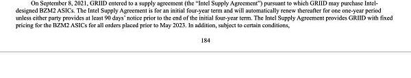 英特尔推出矿机芯片的消息准确性很高,市场发现已经有人与英特尔签下了订单。俄亥俄州矿企GRIID在向SEC提交的S-4文件中透露,GRIID表示已经与英特尔签订了一份长达4年的BZM2采购合同。