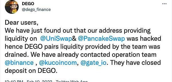 2月10日,DegoFinance官方推特发布公告称被黑客攻击,DeFi世界的乐高就这样“塌了”!