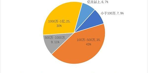 从融资金额区间分布看,据已透露具体融资金额的82家中国区块链企业/项目。43%的公司/项目融资金额在100万-500万美元之间,千万美元以上的单笔融资事件达46%,其中,1000万-1亿美元区间的融资事件占30%。此外,小于100万美元区间的融资事件仅占9%。