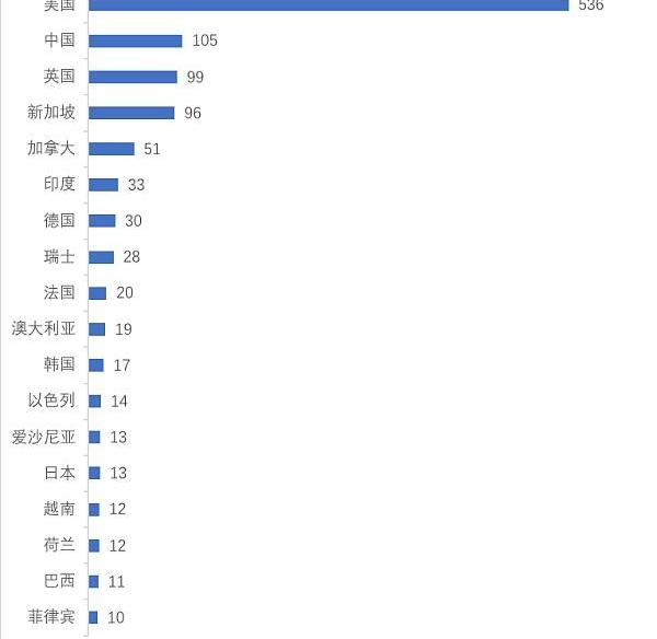 2021年,发生在美国的区块链产业融资事件共计536起,占全球总数的42.54%。中国共计发生105起,位居全球第二,占比为8.33%。此外,英国、新加坡和加拿大均发生超50起区块链投融资事件。整体上看,全球区块链产业融资事件分布不均匀,美国约为中国的5.1倍。
