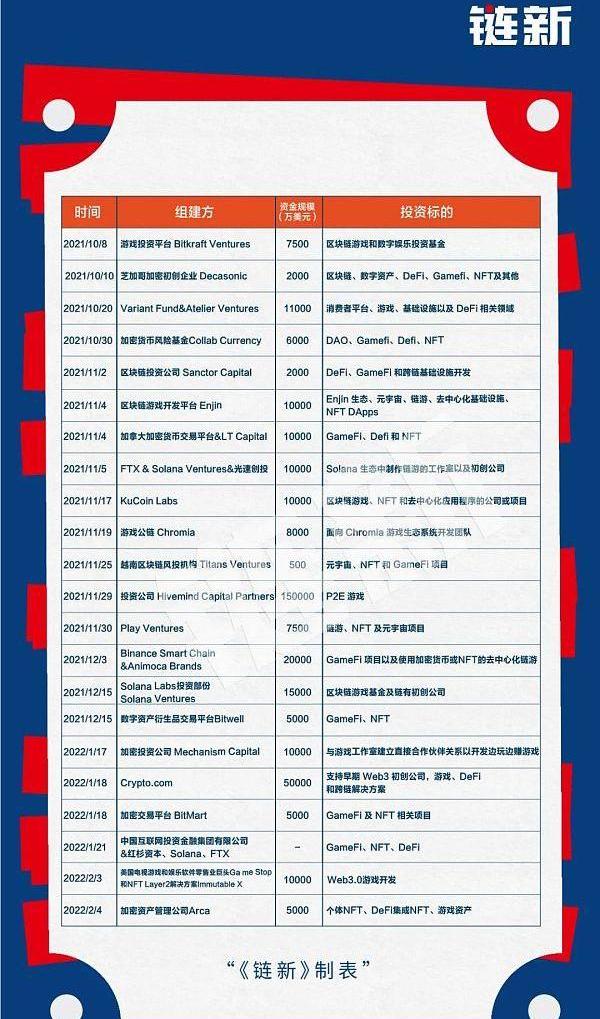 据《链新》统计,仅2021年9月-10月,区块链游戏领域融资规模就高达14亿美元,而从基金组建的角度来看,VC们对链游领域表现出的兴趣还不止于此。
