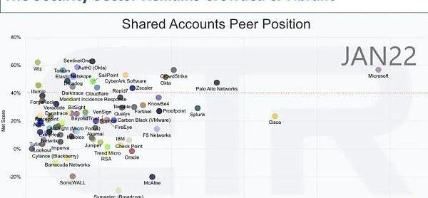 最令人印象深刻的是,PaloAltoNetworks和微软在横轴上有强大的市场影响力,也在40%的线以上。