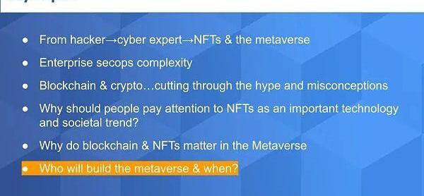 今天,我们将讨论两个话题。一个是和尼克讨论NFTs、tokens代币和metaverse元宇宙。而我们将同时探索企业中复杂的网络安全世界,以及区块链、加密货币和NFTs允许虚拟世界中虚拟物品的所有权,如化身和虚拟服装将为元宇宙的数字所有权提供关键的支撑。