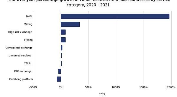 自2018年以来,中心化交易所(CEX)首次占到价值的一半以下(47%),这表明网络罪犯的行为可能发生了变化。DeFi协议用于非法地址的份额从2020年的2%增加到2021年的17%,增幅接近2000%。