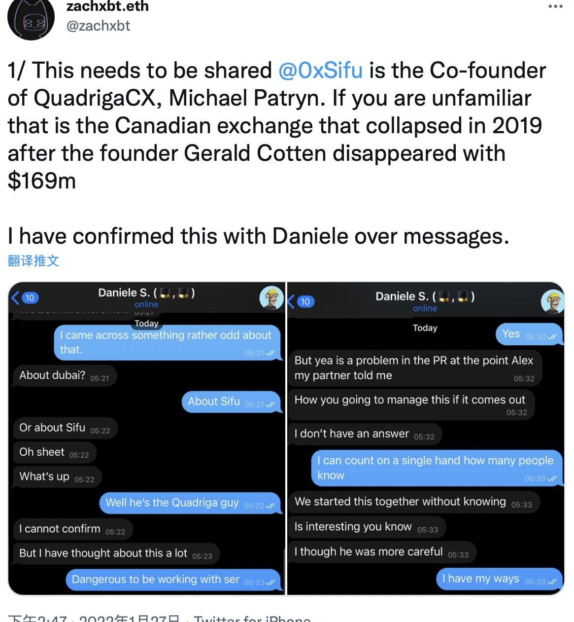 一分钟后,zachxbt就在推特上公布了自己与Daniele的聊天记录,证实0xSifu曾多次参与犯罪。