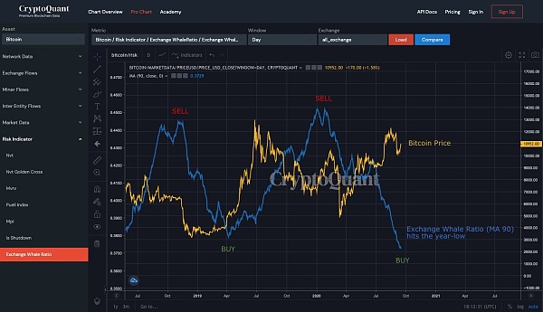 “交易所的鲸鱼比率创下年度新低,鲸鱼转移到交易所的次数越少,抛售就越少,BTC的价格也就越高。”