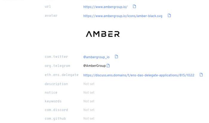 以太坊名称服务是一个基础工具,它将能任何以太坊地址变成一个公共档案。它的主要工作是将人类可读的名字映射到机器可读的标识符。与其用"0x7fc7a9694A09077e137f953108265ad59cCF5ba3"进行交易,你可以输入"amberfin.eth"来代替。而且,由于ENS的层次性,任何拥有该域名的人也可能拥有子域名。例如,因为AmberGroup拥有"amberfin.eth",它也可以创建"pay.mberfin.eth"。ENS域名也可以有文本记录,这使得用户可以存储各种各样的数据,且都只与一个标识符挂钩。在这种设置中,没有中心化的实体或公司参与。