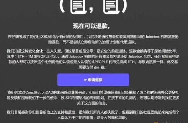 ConstitutionDAO方面落败,故事应该告一段落,连官方也表示要开始组织退款。ConstitutionDAO在自己的平台上表示,退款金额将等于原始捐赠比例,即1ETH=1MPEOPLE代币,通过juicebox捐赠的所有资金也都将退还给juicebox合约。