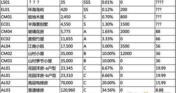 虹宇宙上共有13种房型,总发行量为35万套,根据级别高低可分为SSS、SS、S、A、B、C六级,SSS级的房产暂未发行。SS级“环海岛屿”是目前级别最高的房型,稀缺性也最高,计划发行量只有420套,稀缺度为0.12%。S级包括极地木屋、半海景别墅两种房型,计划发行量分别为2450套、4550套,稀缺度为0.70%、1.30%。