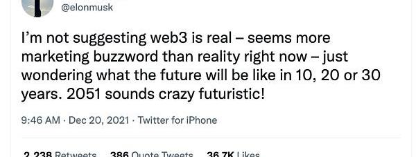 12月21日,马斯克分享了一段1995年大卫·莱特曼批评比尔·盖茨尚不成熟的互联网想法的视频,同时他留言道“现在元宇宙现在看起来更像是流行的营销术语,而不是什么现实。”