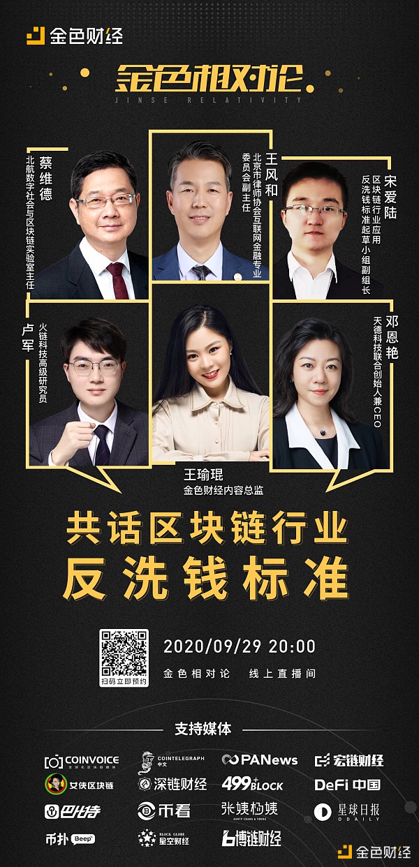 对此,9月29日,金色财经邀请到北航数字社会与区块链实验室主任蔡维德、《区块链行业应用反标准》起草小组副组长宋爱陆、北京盈科律师事务所金融与互联网法律事务部主任王风和、天德科技联合创始人兼CEO邓恩艳、火链科技高级研究员卢军做客「金色相对论」直播间,讨论分享了国家在区块链领域开展的反专项举措!