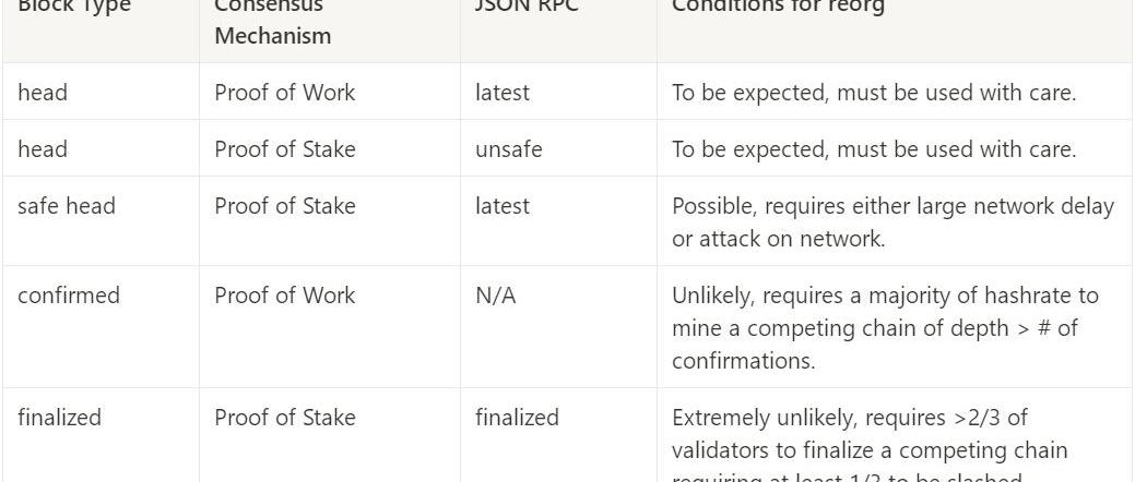 在POW下,总是有可能出现重排的情况,应用程序通常会等待几个区块在一个新的头块上被开采出来,然后再将其视为不太可能从公认链中删除,或"确认"。在合并之后,我们反而有了finalized的和safehead的概念。这些区块甚至可以比"确认"的POW区块更可靠地使用,但需要转变观念以正确使用。