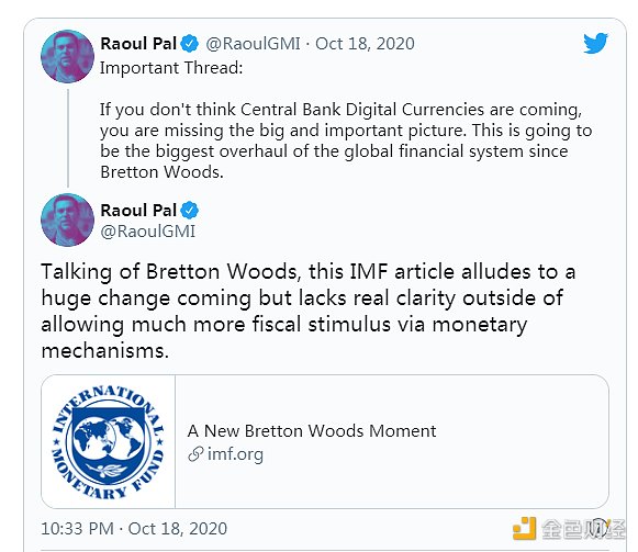 有人推测,随着美元贬值和不可控制的主权债务,IMF正在暗示着一种新的本位货币。分析师Raoul Pal预计,该本位货币将由央行CBDC支持。