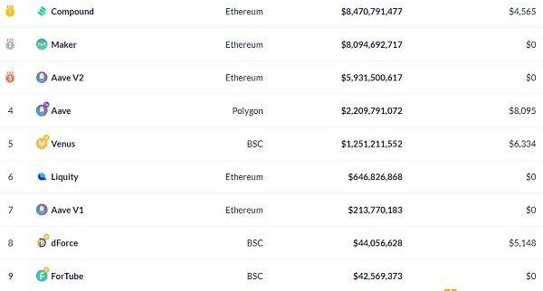 DeFi项目锁定资产前十排名及锁仓量,数据来源:Debank