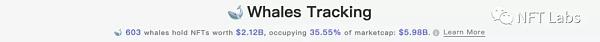 根据NFTGO-WhalesTracking数据,目前共有603位巨鲸持有价值?2.12B的NFT,占总市值?5.98B的35.55%。在最近的24小时内,有57位巨鲸做了291次交易活动,其中大部分来自ParallelAlpha.