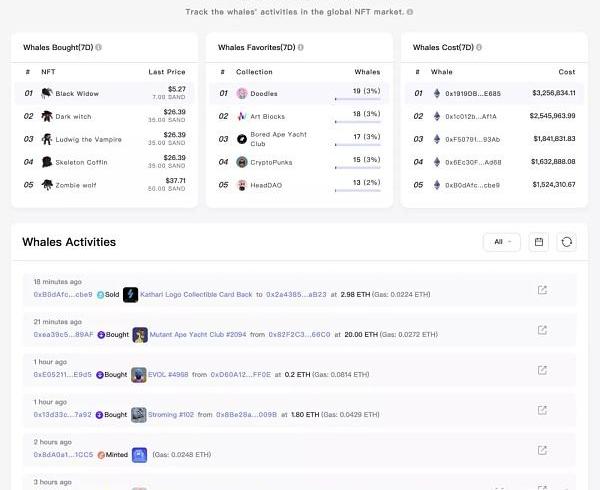 根据nftgo.io数据,有14位巨鲸在过去的7天内买入了CryptoPunks;0x3AC2Cc.....9247在28分钟以前以1ETH的价格买入了Doodle#9600,在52分钟前花费0.9499ETH购买了Doodle#6893,在1小时前花费0.28ETH买入Head#9264等等。