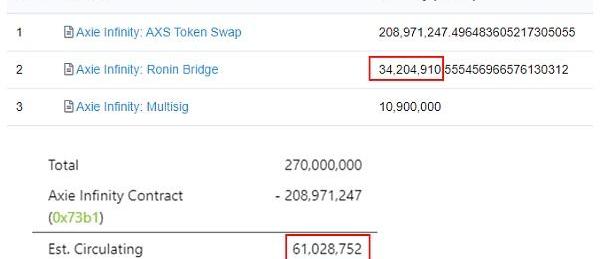 图:通过代币持有者图表分析出Ronin桥接中AXS的总量,流通供应量数据来自CoinGecko。