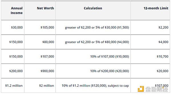投资额取决于投资者的净资产和年收入。如果投资者年收入或者净资产低于10.7万美元,那么在12个月内可以投资的额度为:2200美元和年收入或净资产较高者的5%,两者中的较大者。 如果投资者年收入和净资产等于或超过10.7万美元,那么在12个月内可以投资的额度为:年收入或净资产较高者的10%,但不超过10.7万美元。
