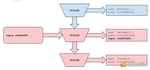 去中心化网络总是存在不同步的情形,如何达到共识是去中心化网络首要解决的问题。在比特币中,节点依靠的是本地时间,每个节点的时间不一样,因此不能用时间戳做判断。Solana的思路是找到一个可验证的、共享的时间。SHA 256作为Solana的验证延迟函数(Verifiable Delay Function),具有不可逆性,只能单向计算。如下图所示,PoH中,上一个输出作为SHA256的当前输入,需要写进的数据附加在输入里,如此往复,周期性地记录每次SHA 256输出和次数,验证节点通过验证和重复这个计算过程得到需要的时间间隔。