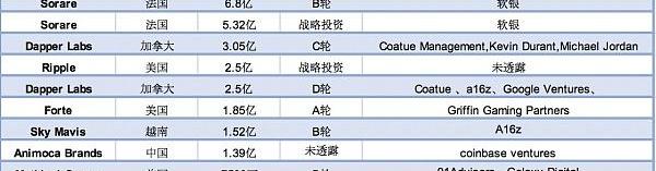 从单笔融资金额看,数字足球NFT收藏平台Sorare以6.8亿、5.32亿美元的融资金额位列前茅。值得一提的是,《NBATopShot》开发团队DapperLabs完成了两次过亿美元的融资,两次融资金额一共是5.55亿美元,表现也非常出色。此外,融资金额过亿的还有Ripple、Forte、SkyMavis和AnimocaBrands。