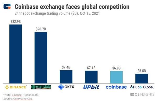 Coinbase面临着来自许多合法加密交易所的直接竞争。Bitfinex、Bitstamp、Kraken和bitFlyer是Coinbase的主要竞争对手,还有像Robinhood这样的传统经纪公司。同时,Coinbase也将加密交易业务扩展到了全球42个国家/地区,包括美国、加拿大、印度、巴西和韩国。因此,该公司现在也与交易量最大的交易所「币安」竞争。