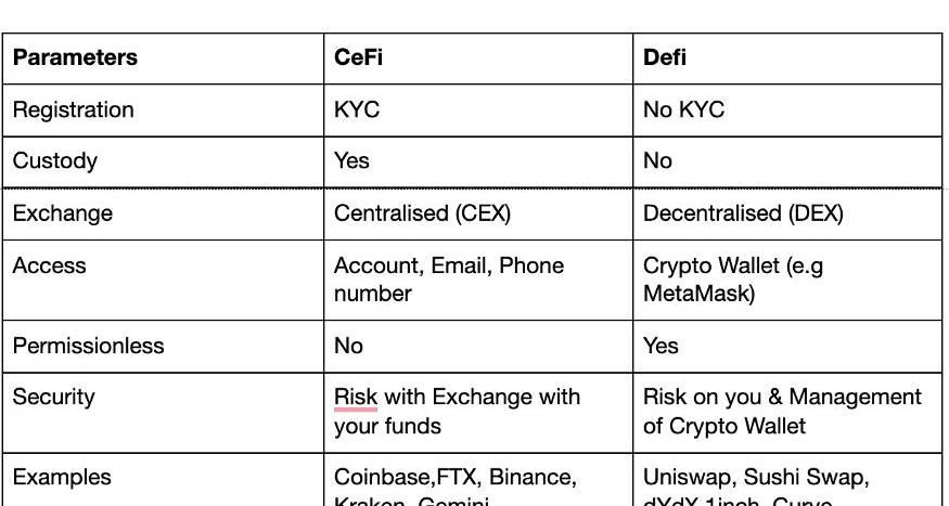 DeFi的交易涉及以无监管的方式购买和出售加密货币,无需设立账户和发送身份证和地址文件,而这一步骤被称为"了解你的客户"。而促进这些交易的去中心化交易所则是中心化交易所的一个替代方案。