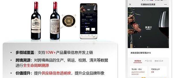 在红酒领域:区块链技术让追溯葡萄酒的真实性、减少欺诈变成了可能。服务了莫塞尔的红酒供应链,基于华为云全新区块链,支持了10W+红酒产品信息并发上链,对红酒的生产、转运、检测、清关等数据进行全生命周期跨境溯源,确保货源的真实性,让消费者放心购买。
