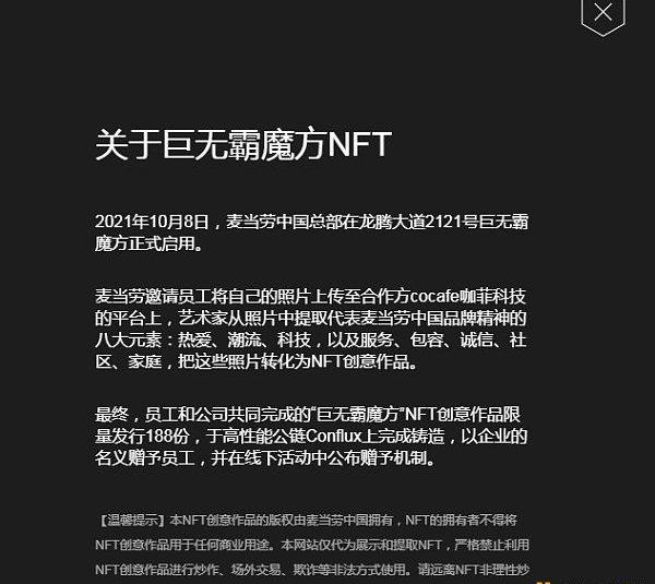 2021年10月8日,麦当劳中国发布首个NFT创意作品“巨无霸魔方”,一共188份,庆祝其进入中国内地市场31周年以及位于上海西岸的新总部大楼正式启用。