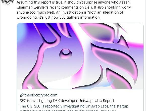 但正如DeFi借贷市场Compound的总法律顾问JakeChervinsky在一条推文中指出的那样:“(对Uniswap的)调查并不意味着对不当行为的指控,这只是SEC收集信息的方式。”
