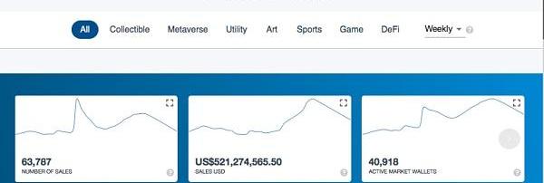 同步的,从更细分的领域来看,来源于NonFungible的数据趋势图,收藏品、元宇宙、公共事务的各板块都呈现下降趋势,游戏在小幅下落后释放出上涨信号。这也从侧面反映出,大环境影响市场各板块的发展繁荣,但拥有越多用户拥趸的板块,将更具应对市场的风险考验的能力。