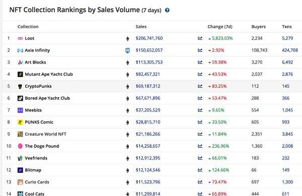 NFT市场最近一直以日新月异的感觉变化着,也附带着非常耀眼吸金力,惹得圈内外各种力量为此而讨论,驻足。一部分的新变化已经在这一轮的火爆中开始涌现,像Loot、Bloot等,用一种直白且不受制于规则的特质变得风靡,当然,这种热度到底能维持多久,我们依然保有价值怀疑论。另一边,AxieInfinity为代表的游戏依然表现不凡。总之,不论“新秀”还是“老牌”,它们用不同特质共同塑造了NFT的不凡。WebX实验室借以数据列举,一同认识这个世界的发展现状。