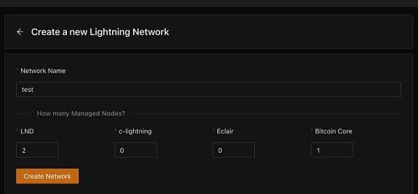 点击“CreateNetwork”,即可在Polar中轻松创建模拟闪电网络环境。你可以随意命名这个网络”是个聪明的选择)并添加两个lnd节点和一个BitcoinCore节点。实际上,对于刚入门的人来说,这些只是最低配,之后还可以添加更多节点。你创建好网络后就可以启动它。首次启动网络时需要的时间可能会长一些,因为你必须下载所有Docker镜像。顺带一提,你需要在自己的设备上运行Docker。就像我之前说的,这里还是得靠自己摸索。