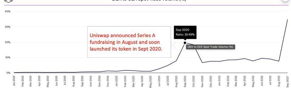 我个人相信,龙头项目发行平台代币,对整个行业的拉动作用非常大。下图展示了衍生品龙头dYdX和现货龙头Uniswap的平台代币发行前后对中心化交易所的影响。可以看出,UNI发行后,现货DEX/CEX比率跃升至20%,之后再也没有回到2020年8月之前的水平。
