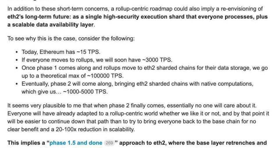 大约在这个时候,Vitalik在EthereumMagicians论坛上发表了长文,论述我们应该把短期和中期的扩容工作集中在rollup上。它们不仅会在阶段2完成前上主网,还会是阶段1的最大受益者。Rollup会生成大量数据,而分片可以为它提供比EVM链消耗更低的存储。下面是文章的截图: