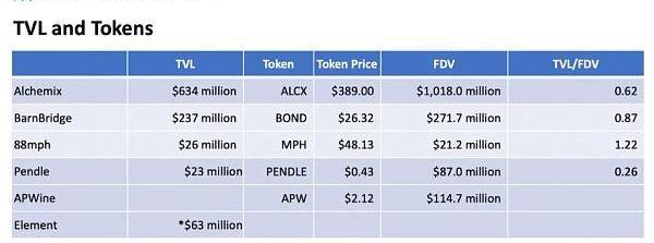协议及其代币处于非常不同的发展阶段,具有不同的特征。BarnBridge和Pendle已上线,拥有代币。APWine处于测试网络阶段,拥有一个代币。Element在没有代币的情况下处于活跃状态。Swivel既没有上线也没有代币。
